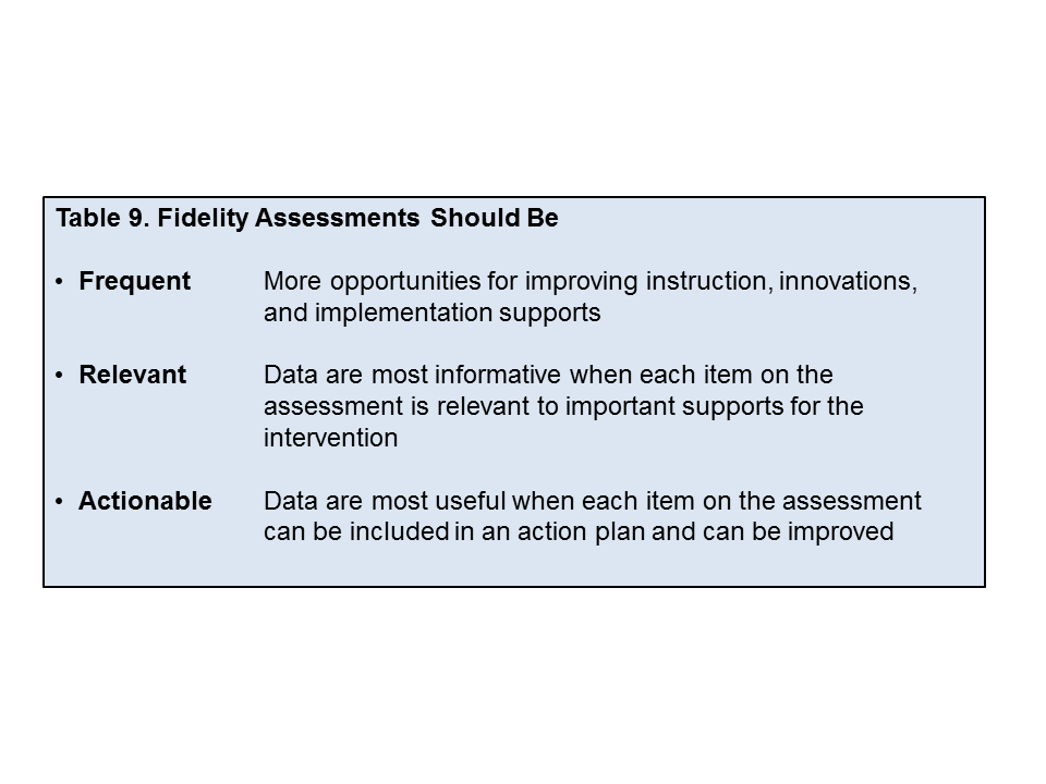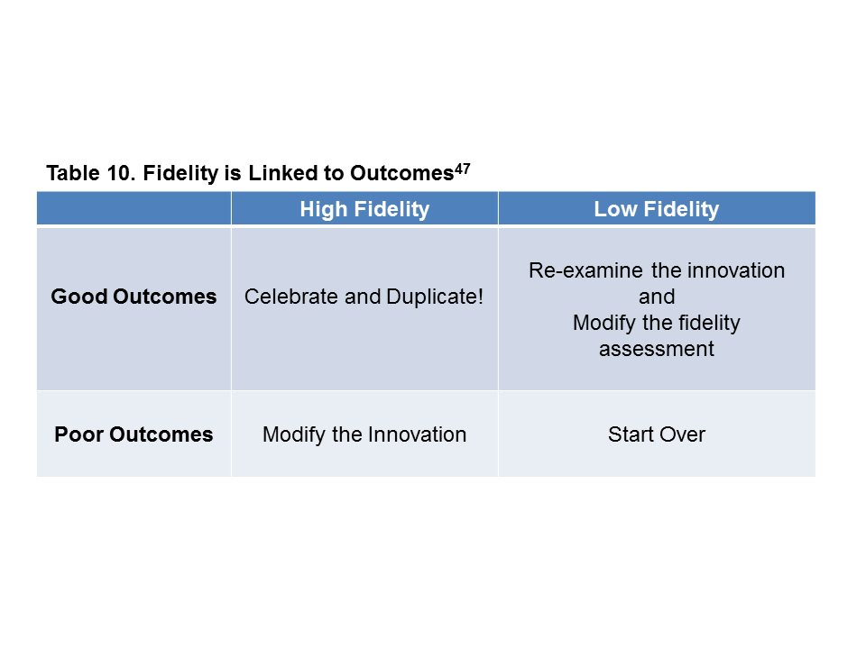 From an implementation point of view, any innovation (evidence-based or otherwise) is incomplete without a good measure of fidelity to detect the presence and strength of the innovation in practice.47 Fidelity assessment measures the strength of the innovation and enables improvement in the implementation plan and process, with the goal of program sustainability.