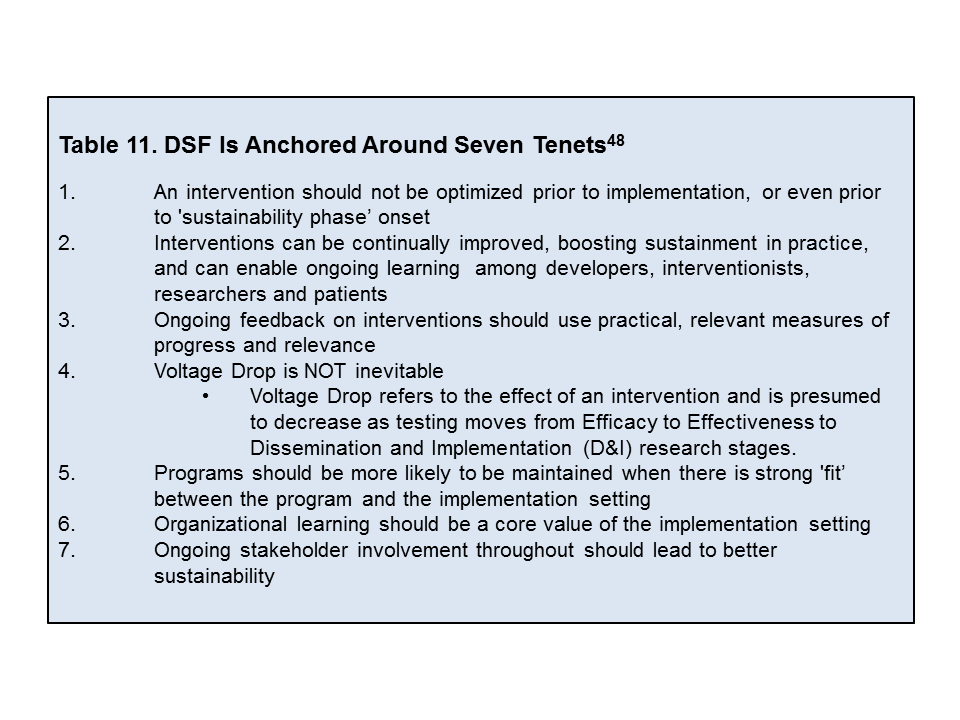 In summary, in the real world, change occurs over time. Therefore ongoing optimization of fit through adaptive, continuous quality improvement is an important aspect of sustaining change. Sustainability can be viewed as a dynamic process and as such can remain viable if the change agent keeps the seven DSF tenets in mind, when developing implementation strategies (e.g., PDSA) for a new program, as well as modification to existing programs.