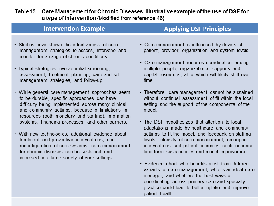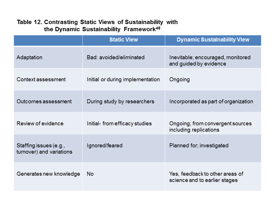 Despite the annual investment of tens of billions of U.S. tax dollars on health research and progress in developing, testing, and implementing evidence-based healthcare practices, we have limited understanding of how to sustain quality health care in routine services.46 The intent of this section is to overview some common models which support, and enhance, program sustainability.