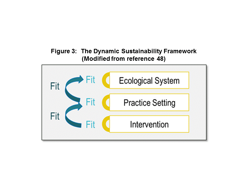 As previously stated, all aspects of health care are undergoing tremendous, rapid, transformations. In many cases departments are cross fertilizing procedures, personnel and other resources. According to Chambers48, the Dynamic Sustainability Framework (DSF) “emphasizes that change exists in the use of interventions over time, the characteristics of practice settings, and the broader system that establishes the context for how care is delivered.” This model emphasizes three focus areas; importance of context, the need for ongoing evaluation and decision making, and the goal of continuous improvement.