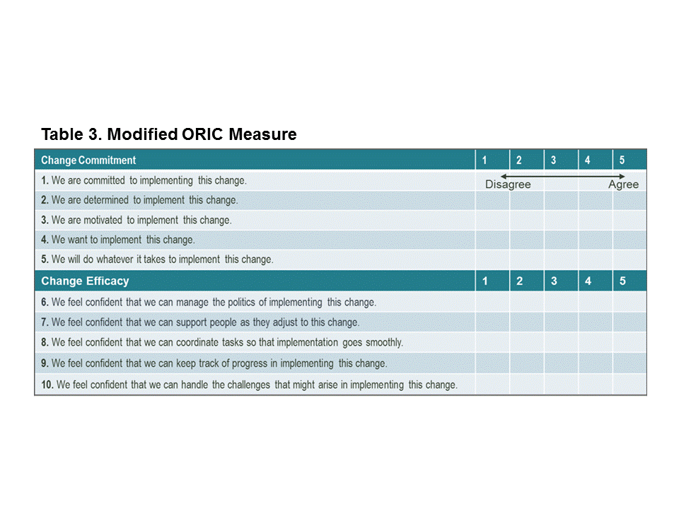 Readiness has also been evaluated and reported in an article that conducted four studies to assess the psychometric properties of a measure called, “Organizational Readiness for Implementing Change (ORIC)”31 These findings suggest that the ORIC measure would enable the testing of theories about change commitment, and change efficacy, with the goal of reducing the number of change efforts that do not achieve benefits. Ultimately the readiness component would be streamlined to be more targeted and efficient (Table 3 illustrates a modified ORIC measure format).