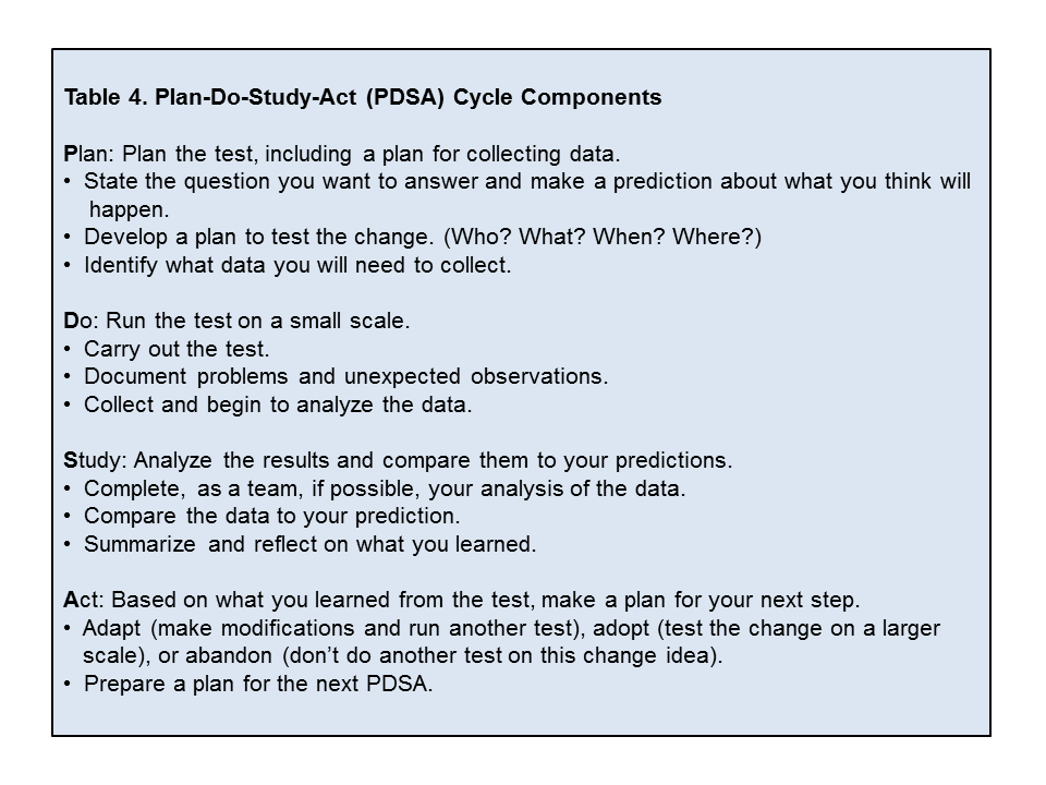 According to the Institute for Healthcare Improvement QI Essentials Toolkit ©,33 Table 4.highlights the concepts that are essential when employing the PDSA Cycle.