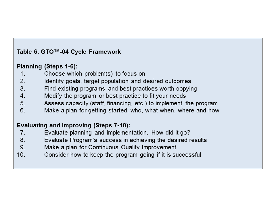 - Wiseman S, Chinman M, Ebener PA, Hunter S, Imm P, Wandersman A. Getting to outcomes™ 10 steps for achieving results-based accountability. Rand® Health Technical Report 2007.