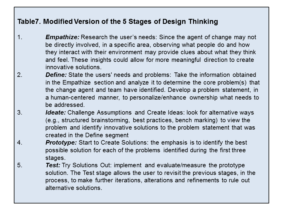 - Ideate—Challenge Assumptions and Create Ideas: look for alternative ways (e.g., structured brainstorming, best practices, bench marking) to view the problem and identify innovative solutions to the problem statement that was created in the Define segment