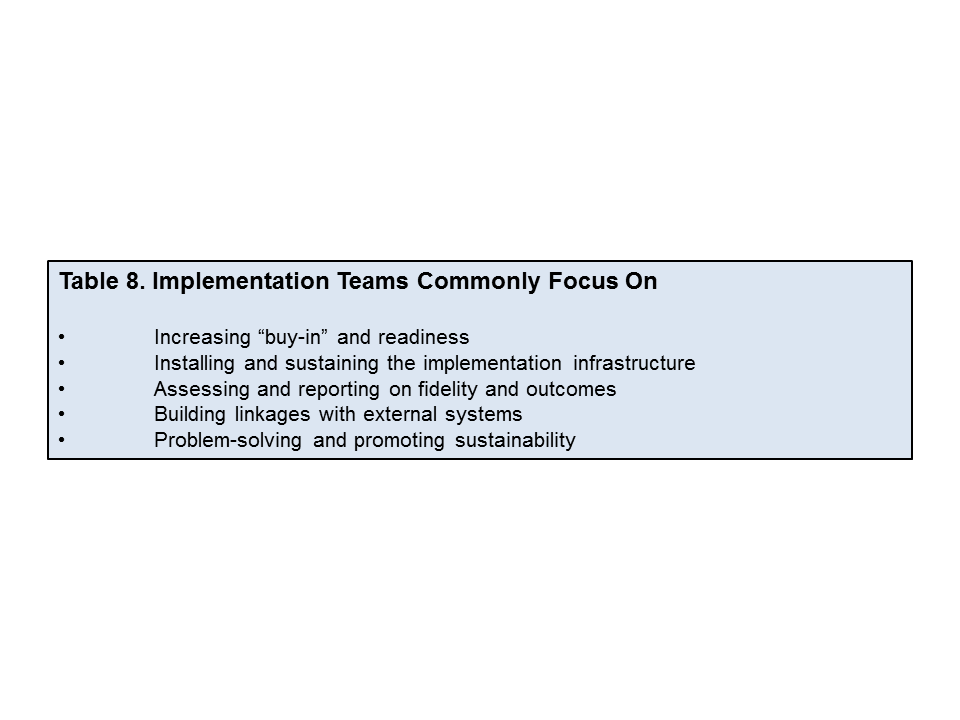 Implementation Teams play an active role by providing an internal support structure to help move innovations through the stages of implementation.45 These teams ensure that the implementation infrastructure is effectively assimilated to support the proposed practice or program.
